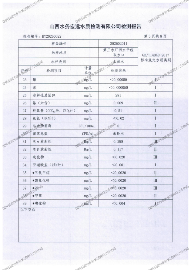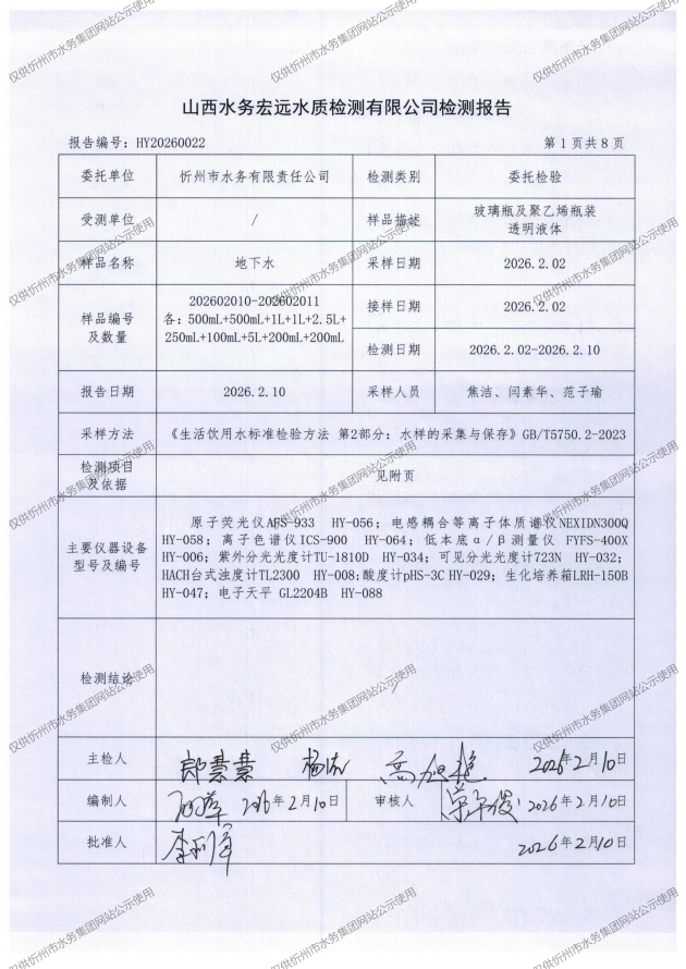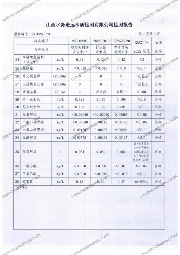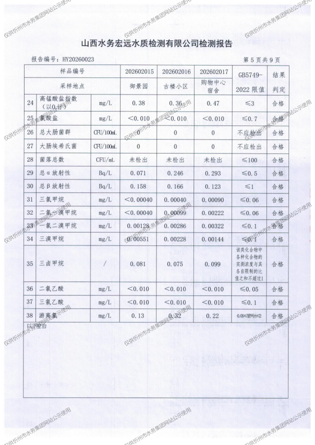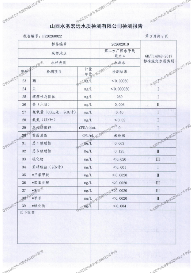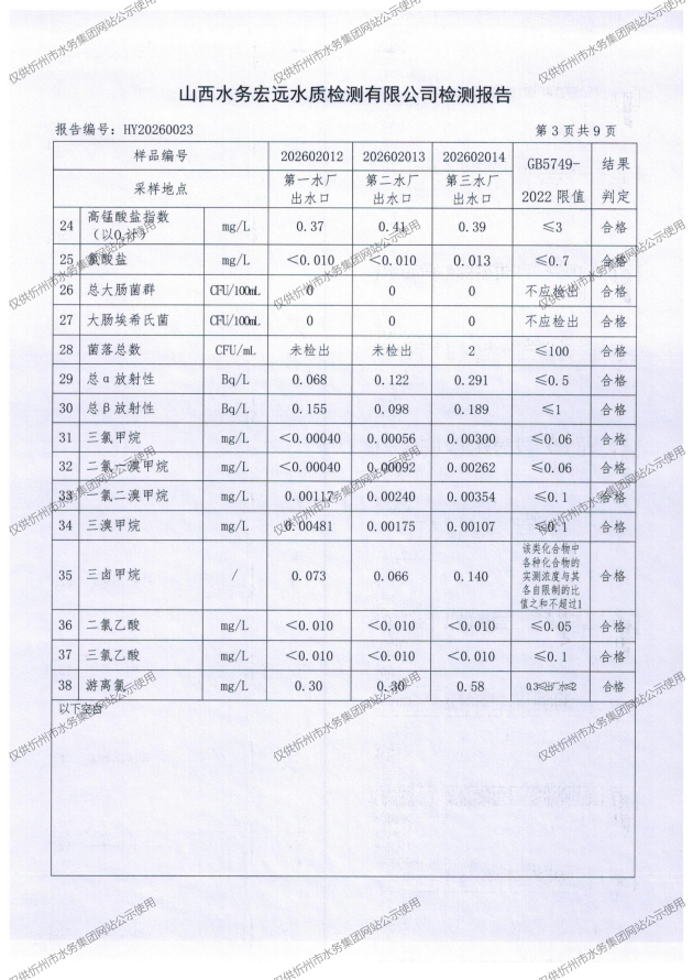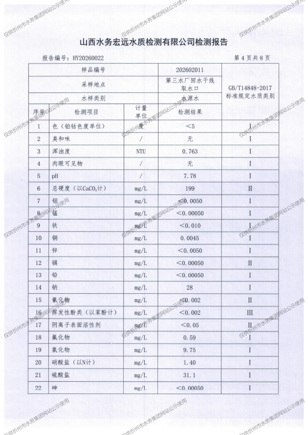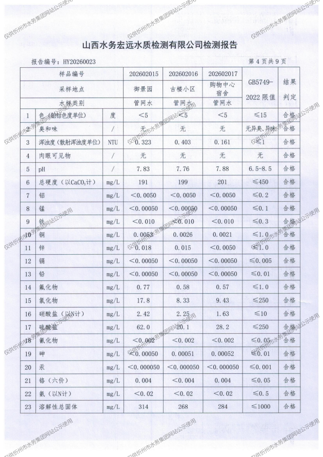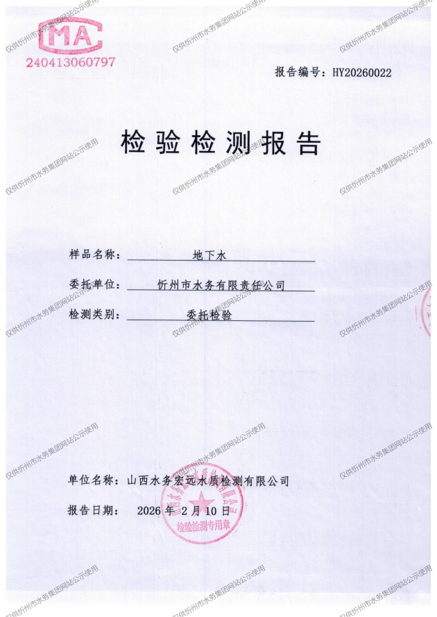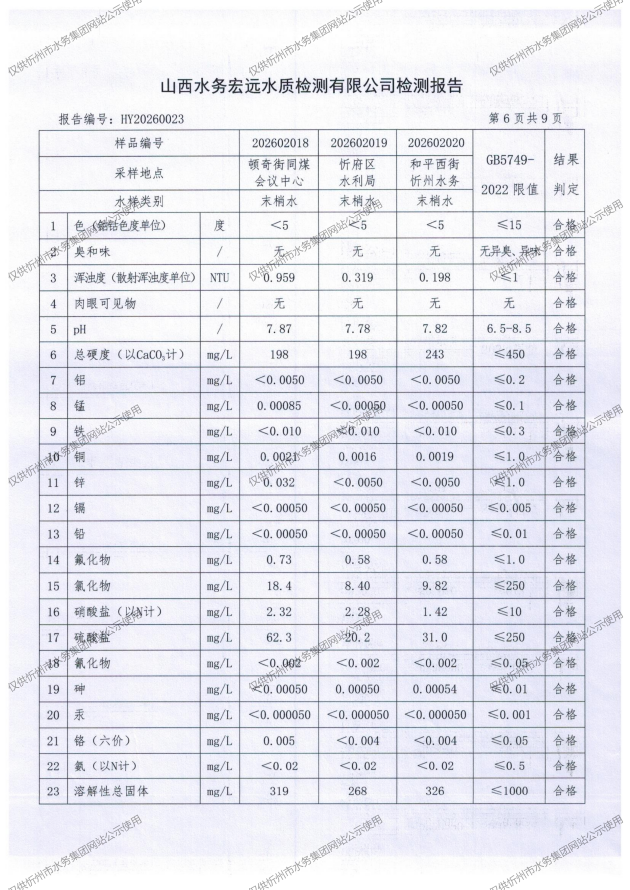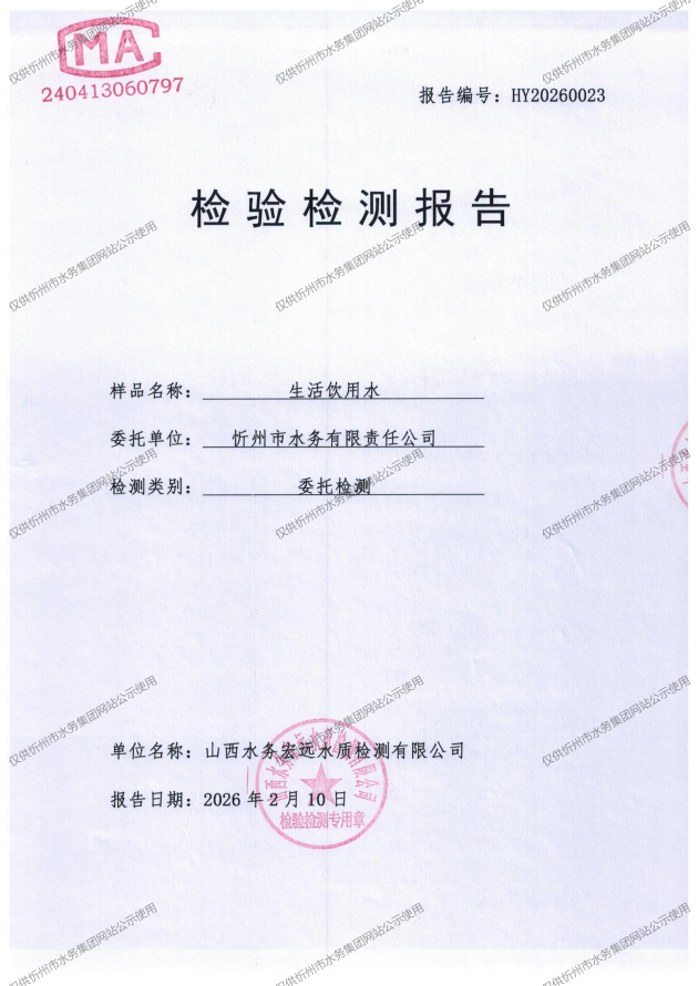 忻州城區公共供水水源水、出廠水、管網水、管網末梢水2026年2月份水質信息公示