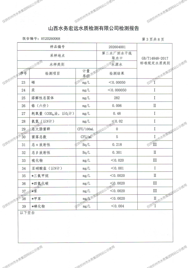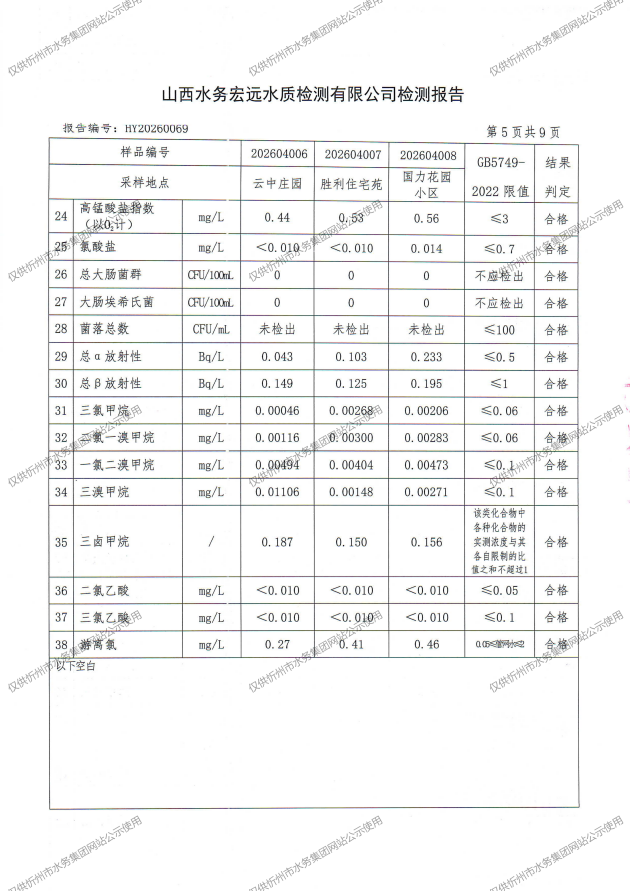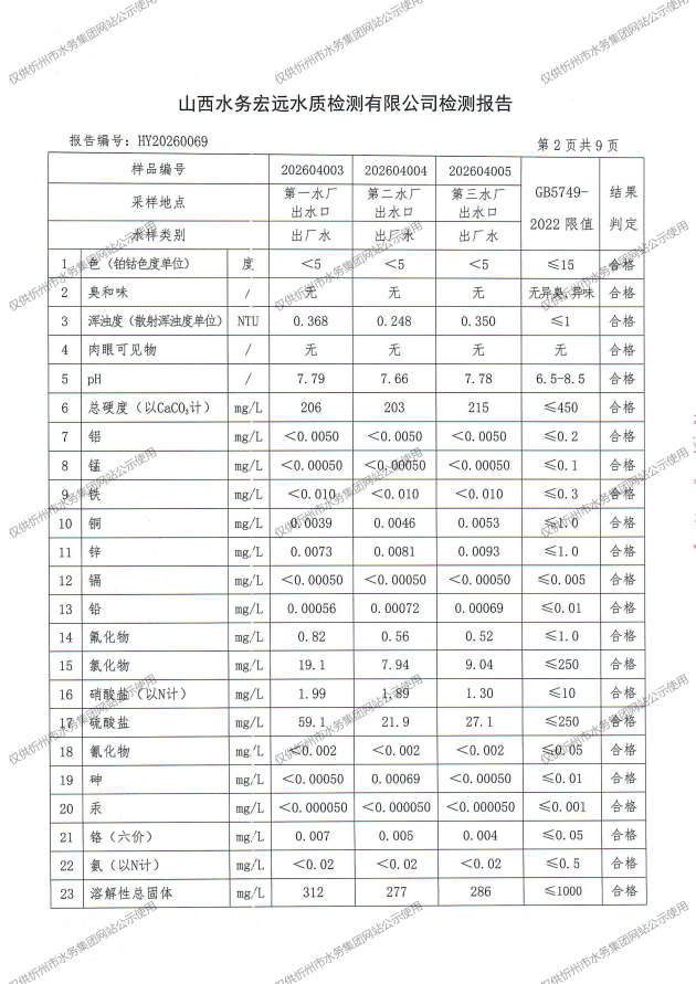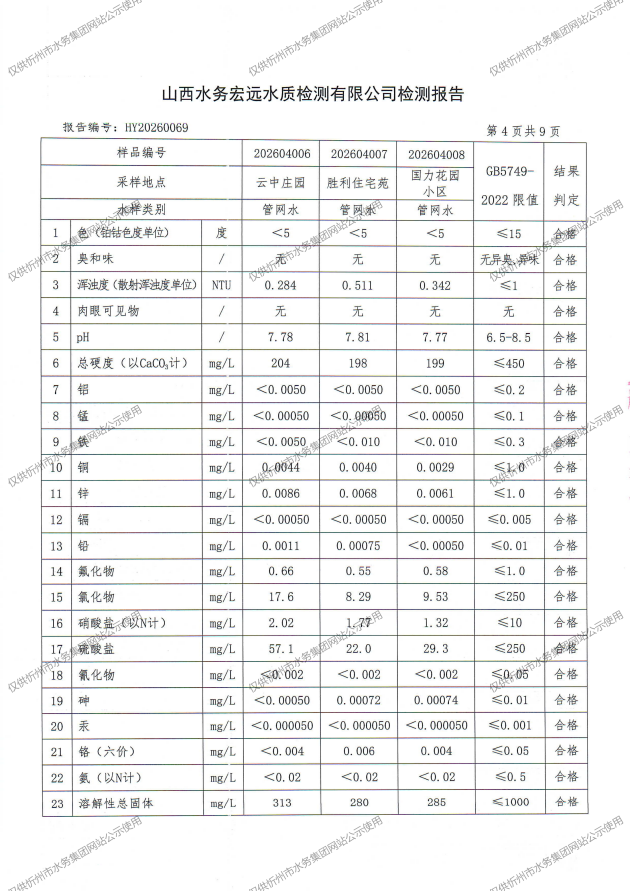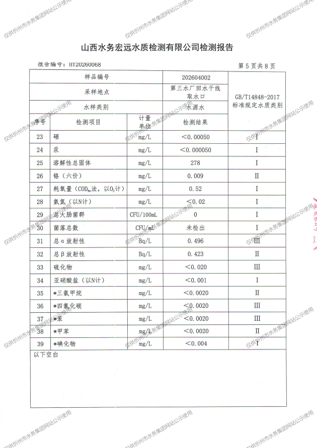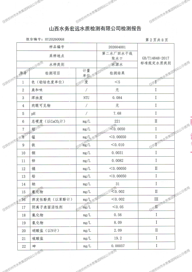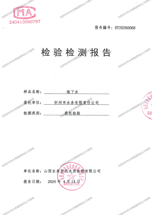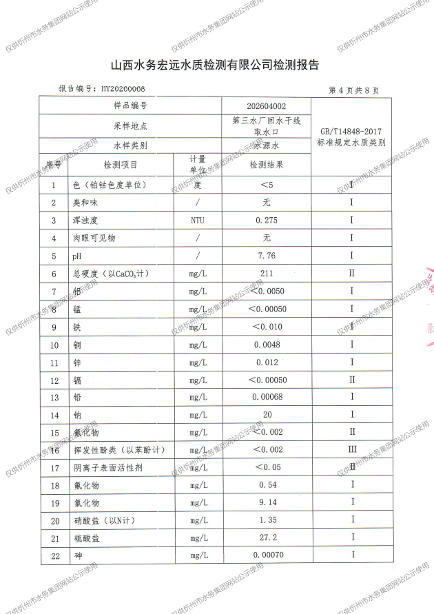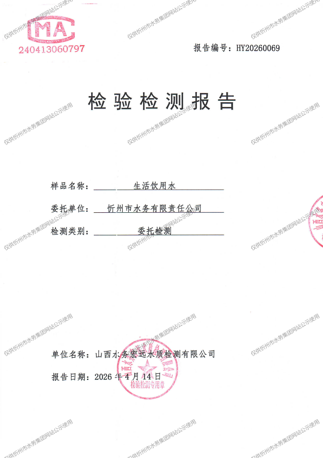 忻州城區公共供水水源水、出廠水、管網水、管網末梢水2026年4月份水質信息公示